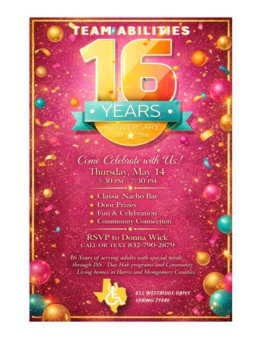 Spring, TX — TEAM Abilities is proud to celebrate 16 years of serving adults with special needs with a vibrant community Anniversary Celebration on Thursday, May 14 from 5:30 PM to 7:30 PM at 611 Westridge Drive, Spring, TX 77380.