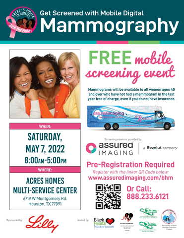 FREE mobile mammography screenings will be available to all women, ages 40 and over, who have not had a mammogram in the last year, even if you do not have insurance. Patients will receive gift bags after completing their appointments. The event is sponsored by Lilly, and hosted by Black Health Matters, the Port City Chapter of the Links, the Spring Cypress Chapter of the Links, The Associates of the North Houston Suburban Chapter of Jack and Jill of America, and the Family Health & Wellness Center. Patients may pre-register at: www.assuredimaging.com/bhm or by calling 888-233-6121.